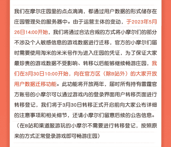 2023年3月24日,,,雷霆游戲和淘米游戲同時(shí)官宣::由于淘米游戲授權(quán)雷霆游戲發(fā)行的《摩爾莊園》手游項(xiàng)目合約即將到期、、、、淘米對摩爾莊園的IP發(fā)展和游戲運(yùn)營有進(jìn)一步的規(guī)劃,,,,經(jīng)過雙方充分友好的溝通,,,決定在合約到期后結(jié)束合作,,《摩爾莊園》手游將在2023年5月26日起移交淘米游戲發(fā)行運(yùn)營。。。。